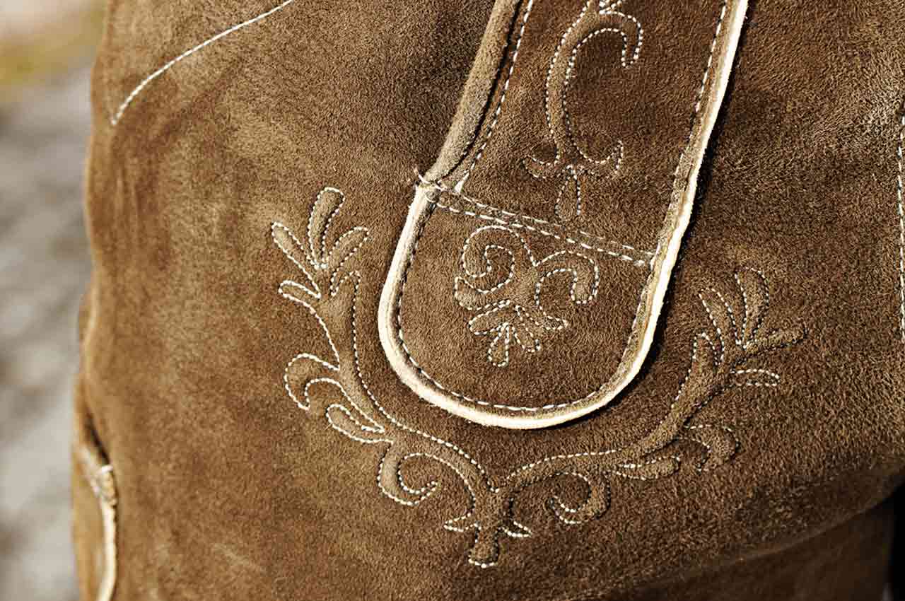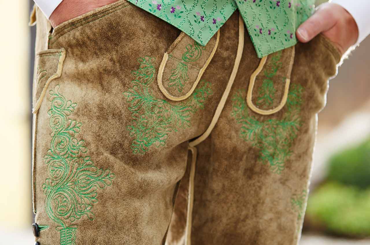 Ein Vielzahl an Gestaltungmöglichkeiten finden hier Anwendung: von trachtigen Stickereien bis zu Paspelierungen und Lampassen an Seitennähten. Häufig werden auch Materialien der Sakkos in die Hosen eingearbeitet. Bei der Materialwahl achten wir auf hochwertige Stoffe.